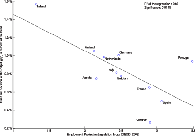 The graphs shows a strong negative relationship between output volatility and the employment protection index (based on employment legislation), suggesting that economies in which labour markets are too rigid are less likely to experience output fluctuations both upwards and downwards. This is logical since an inability of companies to adapt faster to exogenous shocks (both positive and negative) means that the fluctuation of total output will be slower.
