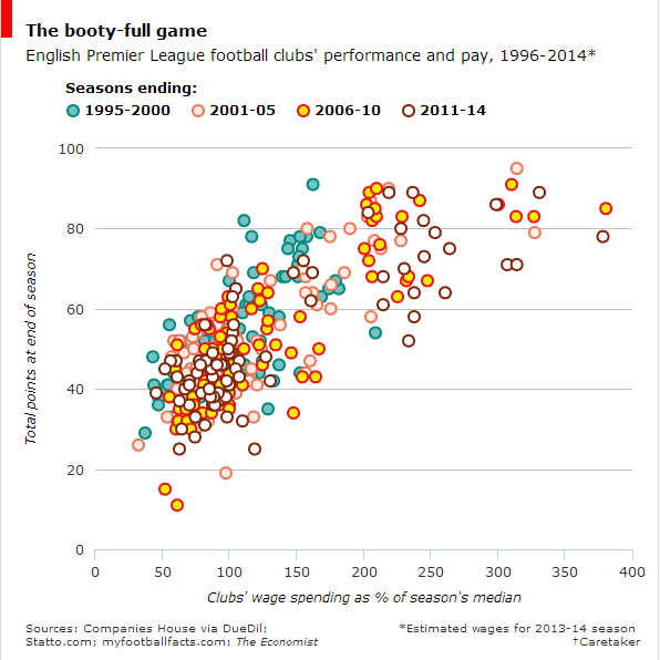 This time they look at the English Barclays Premier League (BPL) and compare club performance in the league (points) for the past 20 years with the money spent on player wages as a percentage of the season's median. Basically the question is how much does money matter?