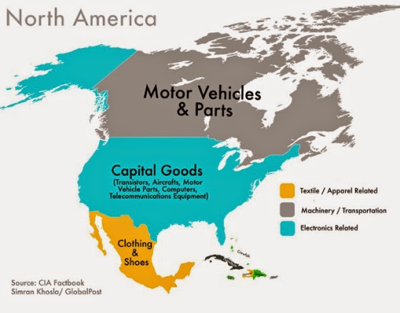 Countries such as the US, Germany or Japan can probably produce any good in the world. But is it better for the US to allocate its resources into e.g. production of clothes and shoes instead of allocating their resources more efficiently into production of computers? They can specialize in producing computers (in which they are, by assumption, the best in the world at), and import clothes and shoes from Mexico, which specializes in precisely these types of goods (see map below). Of course this doesn't imply that the US should have no textile manufacturers nor that Mexico shouldn't produce computers (after all in a globalized world everything is being produced everywhere), it's just a question of opportunity cost of allocating resources into less productive areas vs the more productive ones.