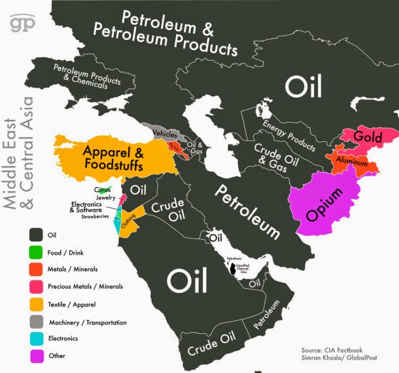 With this in mind Time magazine brings a few maps showing the main exports (by group of products) of each world economy, which paint a very interesting picture of the different types of goods countries specialize in. Bear in mind the map shows the group of products that bring in the most money to a particular country (so it's not the only good they produce, but the most profitable one). We can easily say that this is the type of good that each of these countries "specialize" in.