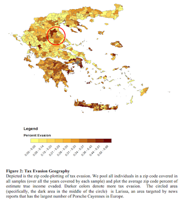 "...Their main finding is that contrary to popular belief that only the super-rich are avoiding to pay their taxes, it is actually the middle classes (the upper middle classes to be precise) which are dodging their taxes. This makes a lot of sense, as 30bn euros is too much to link it only to the super rich. The problem must be more widespread. And it is. Basically across the Greek society. In the map ... you can see that tax evasion is almost evenly distributed geographically...