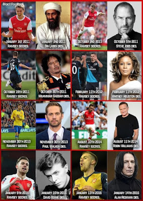 The only thing more silly in the world of football that I can think of is the so-called Ramsey curse - every time Aaron Ramsey, an Arsenal midfielder, scores a goal for his club, a famous person dies. Not only is this ridiculous in so many levels, it is also a serious example of selection bias. Famous people die all the time, regardless of whether Ramsey scores goals or not. In other words, how many times did a famous person die when Ramsey DIDN'T score a goal?
