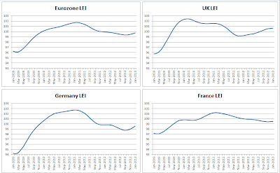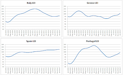 Generally from observing the individual country LEIs it could be inferred that the recovery is on its way in Europe, while it really isn't. I have concluded last time that using this methodology doesn't give us precise leading data, as it generally reacts only to ex-post changes. I stand with that conclusion since there is too much uncertainty in Europe and too much potential exogenous shocks that even in small magnitudes can cause great instability, for the LEI to make a plausible prediction of future economic activity. In Europe we should still pay more attention to announcements and implementation of economic policies. Until we see some significant improvement in pledging to reform, we will not see a recovery.