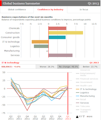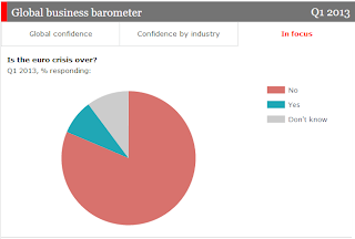 However, to end on a more serious note, a survey done by the FT and the Economist with the final data for Q1 2013 point out that even though "overall confidence, measured as the balance of respondents who think global business conditions will improve against those who expect them to get worse, rose from a dismal minus 11 percentage points in the last quarter of 2012 to plus seven in the first quarter of 2013", a lot of businesses (around 80%, see graph below) still feel that the crisis is not over, and are skeptical on the current regulatory solutions. Also, one of the conclusions was that some of the new growing confidence is yet to be translated into new job opportunities (which is probably why we haven't yet seen a strong upward shift in consumer confidence from the graphs above).