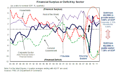 Has this been a successful strategy so far? Not really. The only effect it has caused was a substantial increase of public debt and rising budget deficits (just as it did in Japan), which has forced the politicians into austerity measures to cut these deficits. This is why Koo emphasizes that it's hard to maintain the stimulus for too long in a peacetime economy. But this is far from an excuse. What those graphs rather remind me of is the "World's most important chart" from Goldman Sachs which epitomizes the clear-cut relationship between government deficits and private sector savings. They move perfectly opposite one to another.