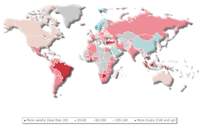 Those with a darker red color seem to have less interpersonal trust (the overall level of the trust index is calculated as 100 + (% of those who say that most people can be trusted) - (% of those who say most people cannot be trusted)). See here for more details, individual country data, continental maps and tables. Some of the countries on the bottom of the list are Trinidad & Tobago, Turkey (!), Rwanda, Cambodia, Indonesia, Ghana, Brazil, and from European countries Cyprus and Portugal. On the other hand, the top 10 are the 'usual suspects' Norway, Sweden, Denmark, Finland, Switzerland, New Zealand, Australia, Nederlands, Canada (countries that top the indicators of economic and personal freedoms), however with a surprising inclusion of China (4th place), Saudi Arabia (7th) and Vietnam (8th). A possible explanation of the lower end of the spectrum could be (among others) conflicts in the past or large ethno-linguistic fractionalization. On the upper end the three outliers could perhaps be explained by lower inequality or even a long-lasting autocratic rule.