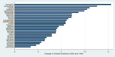 It would be very interesting if we could compare the relative levels of trust a couple of years before the fall of socialism and a couple of years after. Going back to the Aghion et al paper, their finding is that after the transition social capital in every transitional economy decreased.