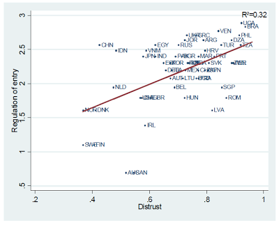 However, more importantly they prove the relationship between low trust and the demand for more regulation (the demand for trust variable is calculated from a couple of World level surveys according to the specific questions asked - see the paper for details).