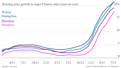 The graph represents growth rates of housing prices in 4 major Chinese cities. Land parcels are being sold for record prices. In Beijing $1100 was paid for a square foot of a residential parcel (compared to Manhattan's average of $323, with the highest bid being $800). Other cities have also experienced a rapid recent growth in real estate prices and land for commercial use. The logical explanation would be that supply is scarce so land prices must go up. This could be true since some cities have applied tougher restrictions on the housing market to discourage speculators. But it is the speculation on the market that is more likely to be driving the rapid price increases: